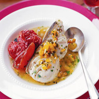1. For poaching liquid in a large skillet combine combine wine, water, sweet pepper, capers, garlic, and crushed red pepper. Bring to boiling; reduce heat. Simmer, uncovered, for 7 minutes, stirring occasionally.