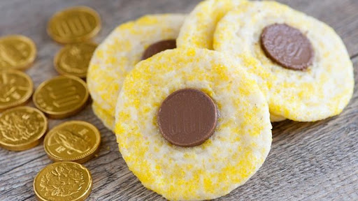Bake 8 to 10 minutes or until edges are light golden brown, gelt may be slightly melted but should hold its shape). Cool 5 to 10 minutes; remove from cookie sheets to cooling racks.