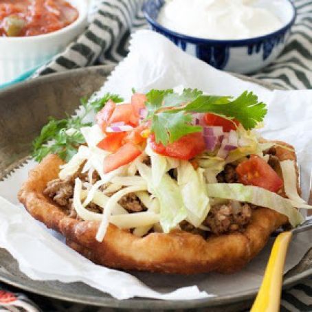 Top fry bread with beef and desired toppings. Serve with a knife and fork, or if you don’t mind a little mess, just like a regular taco.