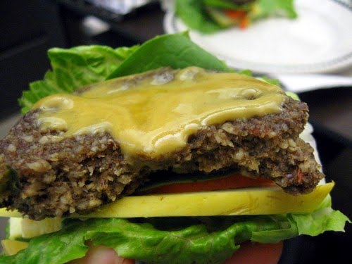 Shape into four patties and dehydrate at 115 degrees for 3-4 hours; flip, and dehydrate for another 3-4 hrs. If you like, you can cook these in a low-temp till crispy, too.