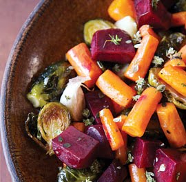 When the beets are cool enough to handle, after about 5 minutes, peel, then cut them into 1-inch chunks. Remove the other vegetables from the oven, toss with the beets, season with salt and pepper, and serve.