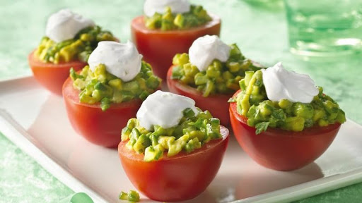 In medium bowl, mix remaining tomato cup ingredients. In small bowl, mix topping ingredients. Spoon about 1 tablespoon avocado mixture into each tomato shell. Top each with about 1 teaspoon topping.