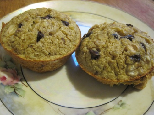 Preheat oven to 350 degrees. Mix all ingredients well. Spray muffin tin with Pam and fill 5 muffin tins with mix. Crumble one walnut half into each tin and sprinkle a few mini chocolate chips in each. (I used a TOTAL of 2/3 of a Tbsp.) Stir in with a knife. Bake 20-22 minutes.