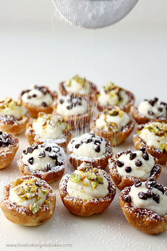 5. Just before serving, remove the filling from the refrigerator. Snip one corner off of the bag and pipe approximately 1 tablespoon of filling into the cooled pastry cups. Sprinkle cups with mini chocolate chips or chopped pistachios. Dust with powdered sugar. Serve immediately.