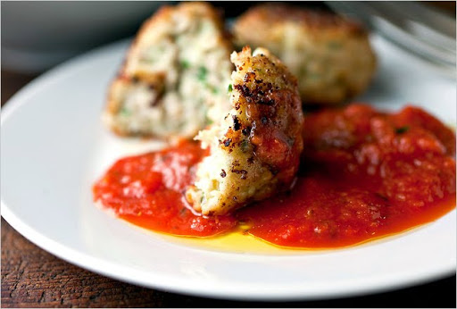 1. Put chicken in freezer while you prepare other ingredients. Put Parmesan, parsley and onion in a food processor and process until everything is finely chopped. Add egg, chicken and a good sprinkle of salt and pepper, and continue to pulse until the chicken is coarsely ground — finer than chopped, but not much. Shape into one-inch meatballs, pressing no more than necessary.