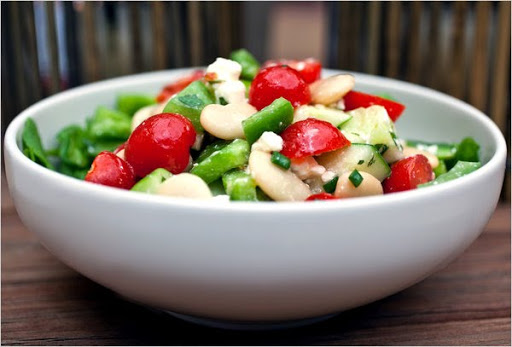 1. Combine the beans, tomatoes, pepper, cucumber, chives, dill or mint, and feta in a bowl, and toss together. Season to taste with salt and pepper (taking into consideration that the feta is already salty). Add the vinegar and olive oil, and toss again.