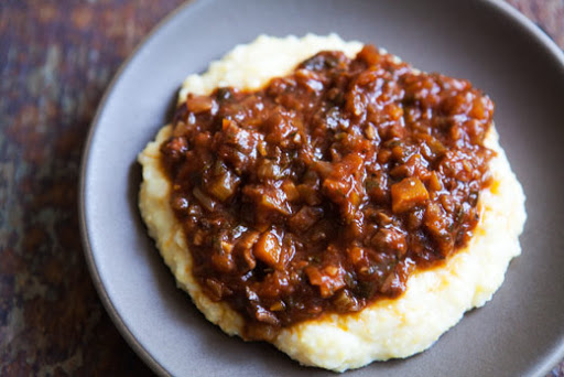 This recipe is a testament to the adage that good things take time (3 hrs). Although the ingredients couldn’t be more simple, the slow cooking at various stages deeply enhances the flavors. First “minced” onions are slowly cooked in olive oil until they begin to caramelize and turn a rich golden color. Then carrots are added, cooked for a while, then celery, and finally garlic and herbs. After the wine, tomato sauce, mushroom soaking water and mushrooms are added, the sauce still cooks for another hour and a half. The sauce is so good I just want to eat it straight with a spoon (and will if it’s anywhere in reaching distance). It shines over polenta, ravioli, or a short pasta like penne or fusilli.