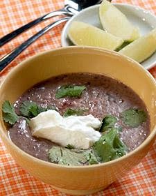 4. Using an immersion blender, or working in batches in a standing blender, puree until thick and smooth. If necessary, add water to achieve desired consistency. Stir in ham. Serve garnished with yogurt, cilantro and lime wedges.