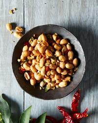 This spiced nut mix gets tossed with kaffir lime leaves, typically used in Thai curry sauces but here fried crisp. The dish is one of many kap klaem (drinking snacks) that Andy Ricker offers at Pok Pok's Whiskey Soda Lounge. "These nuts are served all over Thailand, usually with some kind of dried fish mixed in," he says.