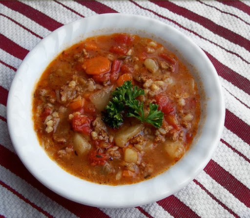 Brown ground beef and onion together until meat is lightly browned. Drain off excess fat. Add all remaining ingredients and bring mixture to a boil.