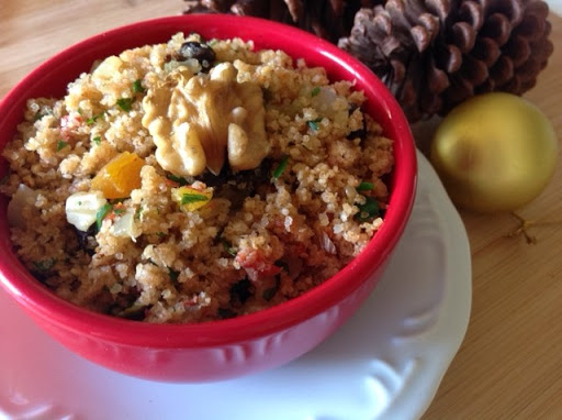 Em uma panela média, refogue no azeite de oliva o alho e a cebola até dourar. Junte os tomates e refogue por mais 3 minutos. Acrescente a farinha de mandioca, o amaranto em flocos, as azeitonas e mexa no fogo por mais 5 minutos. Desligue o fogo, acrescente as nozes, as frutas secas, as ervas, os temperos e misture bem. Sirva quente ou em temperatura ambiente.