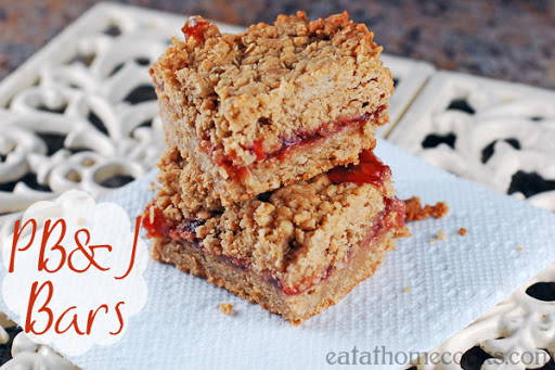 These quick bars combine my favorite flavors in one dessert. Pour yourself a big glass of milk (or if you’re naughty, like me make it chocolate milk). If you like peanut butter and jelly, then you are going to love these. I used strawberry jam to make mine. I think they’d be awesome with grape or blackberry too. Or cherry or…really any kind of jam would be great in these bars. I adapted the recipe for Cherry Oat Bars. I thought I’d be able to decrease the butter, since I was adding in peanut butter, but that didn’t work out. The photo of the ingredients only shows part of the butter you’ll need. I love recipes like this one that use common pantry ingredients. If you’ve got a nearly full jar of jam to spare, then you’ve probably got everything you’ll need to make these.