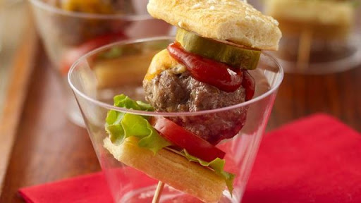 To serve, place 1 crescent square on skewer; add lettuce, tomato, meatball, pickle slice, ketchup and mustard. Top with another crescent square.