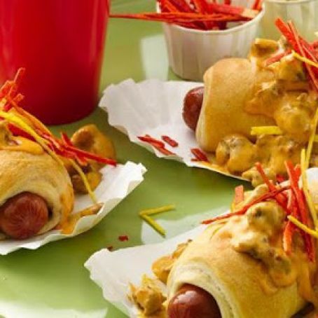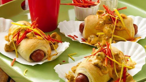 These yummy chorizo sausages mixed with nacho cheese sauce and topped with a Southwest inspired crescent dog are the perfect appetizer. The nacho strips can be colored to match your team for game day or special event's theme. Very cool and delicious!