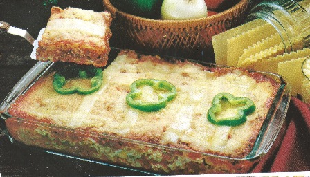 . In large bowl mix together tomato juice, tomato sauce, tomato paste, onion, oregano, basil, salt, pepper, garlic, brown sugar and Worcestershire sauce. Stir in drained meat. Spread Vz cup meat sauce over bottom of 2-qt. oblong dish.