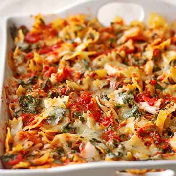 Cook pasta according to package directions; drain. Meanwhile, in a medium bowl combine spinach and crabmeat.