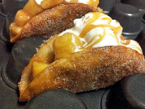 Fill taco shells with apple pie filling and top with whipped cream, and sprinkle a little more of sugar-cinnamon mixture on top.