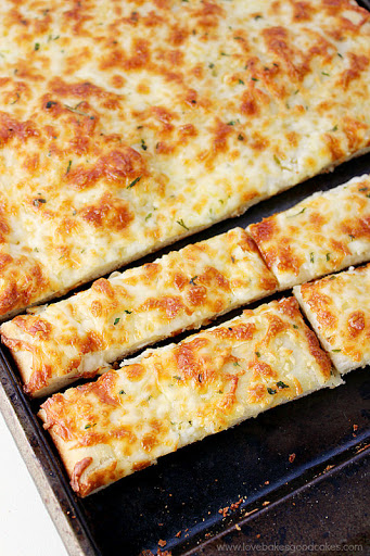 7. Bake for 11 to 15 minutes or until golden brown. Carefully remove the cheesy breadsticks to a large cutting board. With a pizza cutter, cut in half lengthwise, then cut into 8-10 strips. Serve warm.