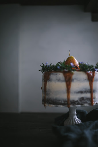 Layer and ice the cake with the buttercream. Place the iced cake over a square of paper towels and pour 1/2 cup of the salted pear caramel sauce over the cake, allowing the excess to drop onto the towels. Garnish with fresh fruits and herbs and serve immediately.