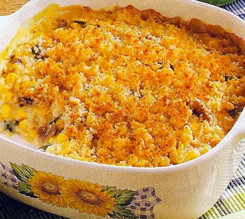 in saucepan, saute green pepper and onion in 1 tbsp butter. Stir in flour, cream corn, salt and pepper. Add cream cheese and stir until melted. Stir in whole kernel corn, mushrooms and cheese. Transfer to a baking dish. Melt remaining butter and toss with bread-crumbs. Sprinkle over corn mixture. Bake at 400 for 20 - 25 minutes.