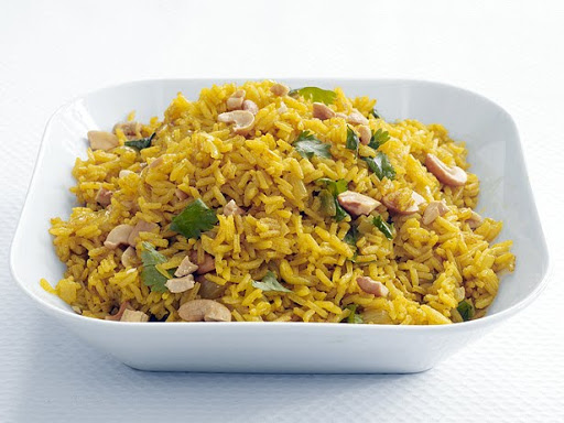 Saute 1 chopped onion, 2 smashed garlic cloves, 1 cinnamon stick, a strip of lemon zest, 1/2 teaspoon curry powder and a pinch of turmeric in a saucepan with butter and olive oil until lightly browned. Add 1 cup basmati rice and stir until toasted. Add 1 1/3 cups water, season with salt and bring to a boil, then cover and simmer 15 minutes. Let sit 5 minutes, then fluff with a fork and add a splash of lemon juice and some cilantro and cashews.