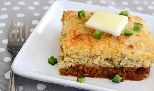 Preheat oven to 350 degrees. Empty 4 cans of chili on the bottom of a greased 8 x 10 inch baking dish, then set aside. In a large mixing bowl, beat egg, oil and milk. Add cornbread mix, green chili and cheese and stir until moistened. Pour the batter into the prepared baking dish over the vegetarian chili. Spread the batter with a spatula in an even layer. Bake for approximately 35 to 40 minutes until the cornbread is golden brown and an inserted toothpick comes out clean. Let cool for 5-10 minutes. Slice into squares and garnish with butter and diced jalapenos. Enjoy!