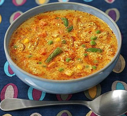 2. Add the vegetables and quinoa, then stir in the milk. Bring to the boil, simmer gently for 10 mins until the quinoa is cooked. Check seasoning. Serve with warm naan bread.