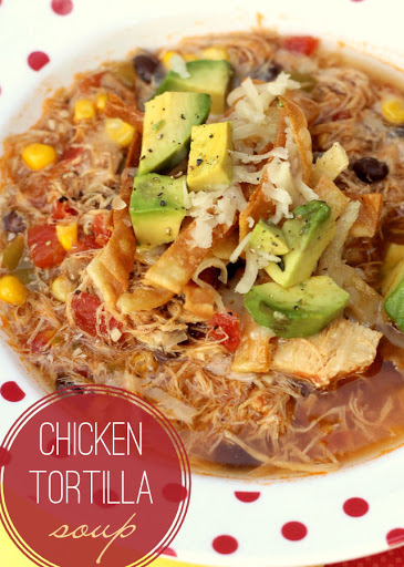 Add all the ingredients, except the cheese, corn tortilla strips and avocados to your crock pot. Cook on low for 8 hours (or high for 3-4 hours).