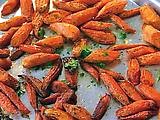 If the carrots are thick, cut them in half lengthwise; if not, leave whole. Slice the carrots diagonally in 1 1/2-inch-thick slices. (The carrots will shrink while cooking so make the slices big.) Toss them in a bowl with the olive oil, salt, and pepper. Transfer to a sheet pan in 1 layer and roast in the oven for 20 minutes, until browned and tender.