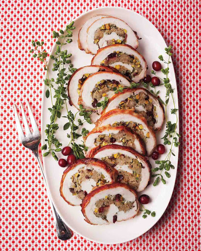 Place turkey, skinned-side down, on a work surface. Season with salt and pepper. Spread stuffing over top, leaving a 1/2-inch border. Working from one short side, roll breast up tightly into a log, enclosing stuffing. Turn seam-side down. Drape bacon slices over breast, overlapping slightly to cover completely. With kitchen twine, tie at 4 even intervals; replace any stuffing that falls out.