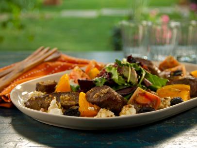 Grilled Lamb Sausage with Goat Cheese, Heirloom Tomatoes, Olives and Herbs