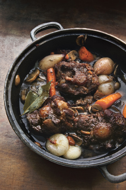 Bourguignonne refers to any dish cooked in the style of Burgundy, France. This dish is similar to classic boeuf bourguignonne (French beef stew), which is beef braised with red wine and mushrooms. Although oxtail was once the tail of an ox, these days the bony cut is beef or veal. Mashed potatoes would make the perfect side dish.