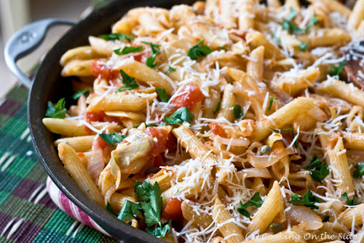 Saute the slicedonion in 1/4 cup of olive oil. Add artchokes finely sliced. Cook to pale gold color over high heat, then add the capers and tomatoes seasoned to taste. Cook over moderate heat. Cook pasta for 13 minutes in boiling salted water. Drain and add the artichoke sauce. Sprinkle with chopped parsley and grated parmesan.