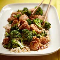 4. To serve, pour sauce over chicken. Surround chicken with steamed broccoli. Sprinkle with sesame seeds and green onion tops. Serve with brown rice, if desired.