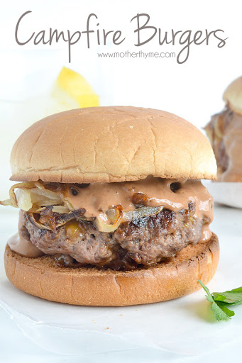 Assemble burgers on toasted buns topped with caramelized onions and campfire sauce.