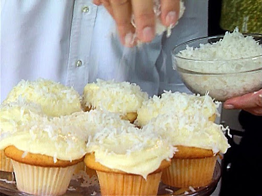 Frost the cupcakes and sprinkle with the remaining coconut.