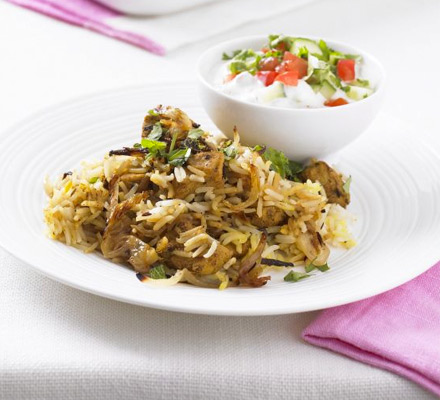 5. Spoon half the chicken and its juices into an ovenproof dish, about 25 x 18 x 6cm, then scatter over a third of the roasted onions. Remove the whole spices from the rice, then layer half of the rice over the chicken and onions. Drizzle over the spiced oil. Spoon over the rest of the chicken and a third more onions. Top with the remaining rice (step 4) and drizzle over the saffron-infused milk. Scatter over the rest of the onions, cover tightly with foil and heat through in the oven for about 25 mins. Serve scattered with the mint and coriander.