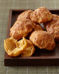 Bake the gougères for 15 minutes. Reduce the oven temperature to 350° and bake for 30 minutes longer, switching the baking sheets halfway through, until the gougères are puffed and browned. Turn off the oven, propping the door ajar with a wooden spoon. Let the gougères rest in the oven for about 30 minutes longer, until crisp on the outside but still steamy within. Serve warm or at room temperature.