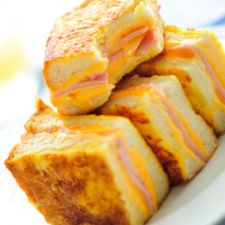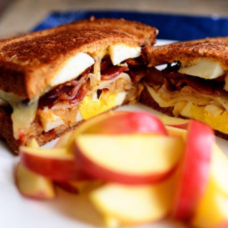 To assemble, spread one side of each piece of bread with the spicy mayo. Build the sandwich however you wish: eggs, bacon, cheese, onions, more eggs, more cheese. Spread one side of the assembled sandwich with softened butter and put it butter-side down on a griddle or skillet over medium-low heat. Spread the top side with butter, then continue grilling the sandwich until the bread is golden and slightly crisp and the filling is warm/cheese is melted.