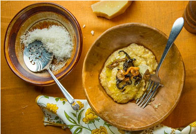 6. In individual small bowls, grate a fluffy mound of Parmesan in the center, about 3 tablespoons per bowl. Make a well in the Parmesan mound. Carefully place an egg yolk into each well. Ladle the piping hot polenta over to cover. Shave truffles or pecorino al tartufo over the polenta, or top with sautéed mushrooms or truffle salt. Drizzle with olive oil and serve immediately.