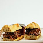 Meanwhile, cut baguette into quarters; cut each lengthwise in half and spread with scant 1 tbsp (15 mL) mustard. Top with beef and onions. Serve with hot jus for dipping.