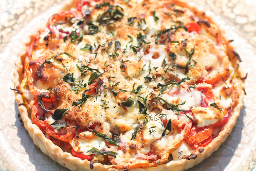 Preheat oven to 350 degrees. Grease a 2 quart pie dish. Fit Pie Crust into Pie Dish, prick some holes at the bottom with a fork and bake in pre-heated oven for ten minutes. Line pre-baked pie crust bottom with a layer of the Heirloom tomatoes topping with half of the thinly sliced red onion, garlic, thyme, oregano, shredded mozzarella and Romano cheeses, and the goat cheese. Prepare a second layer using the same process beginning with the Heirloom Tomatoes. Sprinkle the garlic powder, salt and pepper across the pie then fresh basil. Bake at 350 degrees for approximately thirty minutes until the cheeses are melted, slightly bubbling and the pie is steaming hot. Serve warm or at room temperature.
