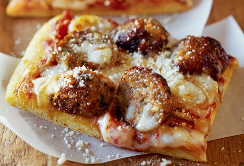 Lightly brush the raised edge of the dough with olive oil. Spread the tomato sauce over the dough, leaving a 1⁄2-inch border uncovered. Scatter the onion over the sauce. Arrange the halved meatballs on top. Sprinkle with the mozzarella and season to taste with pepper. Carefully slide the pizza-topped parchment paper from the peel or baking sheet onto the hot pizza stone (or overturned cast-iron skillet). Bake until the crust is golden brown and the cheese is bubbling, 9 to 12 minutes.