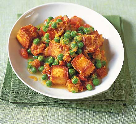 Fry the paneer in 2 tbsp of oil until golden brown. Scoop out. Fry the onion mix until fragrant, about 5 minutes. Stir in the spices, then the tomatoes and stock, and simmer for 10 mins until thickened. Add the paneer and peas and cook for 5 minutes
