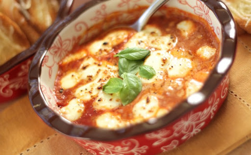 In either four 12-oz. temp-tations® mini pie dishes or one 1.5-quart temp-tations® baker, layer pasta sauce, garlic and then mozzarella.