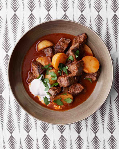 Return steak to pot, along with any juices. Cook until warmed through. Season with salt and pepper. Reserve half of stew for next day; serve remainder with sour cream, parsley, and more pepper.