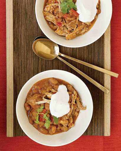 Oven method: Preheat oven to 350 degrees. Follow step 1, using a 5-quart Dutch oven or large pot, substituting 2 cans (15 ounces each) pinto beans, drained and rinsed, for dried beans, and increasing water to 2 cups. Cover pot and bring to a simmer on top of the stove. Transfer to oven, and cook until chicken is tender, 1 1/2 to 2 hours. Proceed with step 3.