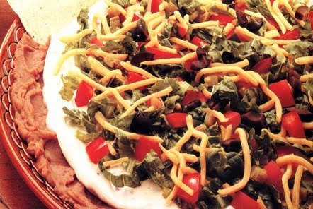 Spread cream cheese mixture over the beans leaving about 1 in. uncovered around the edges Top with layers of lettuce, cheese, tomato, olives and chilies. Serve with tortilla chips. Yield: 16 20 servings.
