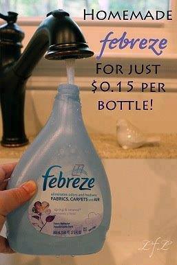 Using a funnel, pour fabric softener and baking soda into your spray bottle. Fill spray bottle with hot tap water and shake well. Don't forget to twist the nozzle over to the LOCK position if you're using a Febreze bottle, or you might fall on your hiney. Now go spray every fabric surface in your house and take a nap on your very comfortable and now un-stinky couch.