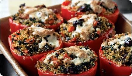 Preheat oven to 350°F. Boil 1 1/3 cups water in a saucepan; add quinoa. Reduce heat, cover, and simmer for 15 minutes. Keep covered; set aside. Remove pepper tops, stems, and seeds. Bring a large pot of water to a boil. Add peppers, boil for 5 minutes, and drain. Heat oil in a skillet over medium heat. Add carrots; cook for 3 minutes. Add onion; cook for 5 minutes more. Stir in spinach and beans. Remove from heat and mix in quinoa and chili powder. Fill peppers with quinoa mixture and place upright in a baking dish. Sprinkle with cheese. Add just enough water to form a very thin layer in the bottom of the dish. Bake for 20 minutes or until tops are lightly browned. Serve immediately